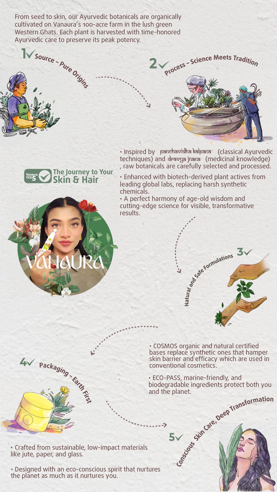 Vanaura Organics was founded by Dr. Nayana Sivaraj, who envisioned safe and natural alternatives to synthetic skincare. Each product goes through our 5 TICK journey before it reaches you. It begins with ethical sourcing from our 100-acre COSMOS-certified farm in the Western Ghats. The ingredients are then processed using Pañcavidha Kalpana (पञ्चविधकल्पना) and enriched with biotech-derived plant actives. They are carefully crafted into safe formulations, packaged sustainably, and designed to deliver deep, transformative care. By blending Ayurvedic wisdom with advanced organic science, Vanaura creates conscious personal care that nurtures skin and hair from within.
