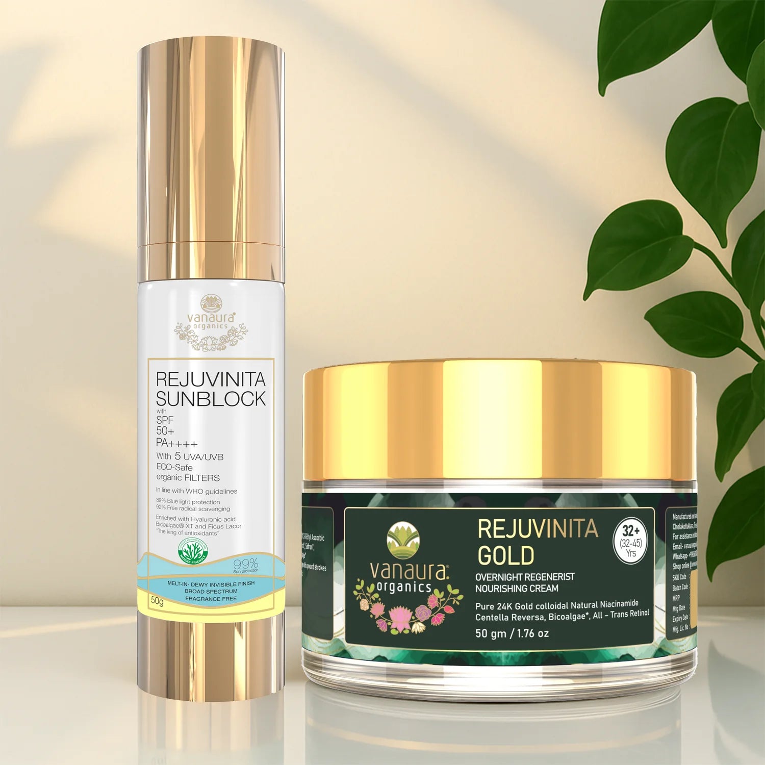 Rejuvinita Gold 32+ Overnight Cream – Infused with 24K Gold Colloidal and potent botanicals, it deeply nourishes, repairs, and restores skin overnight. Targets fine lines, wrinkles, blemishes, and pigmentation while improving elasticity and firmness for a radiant, youthful look.