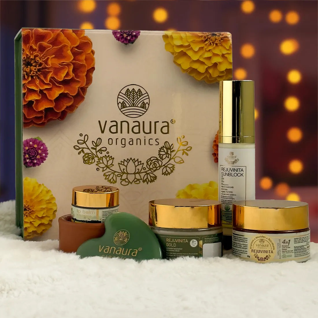 The Golden Glow Essentials box is specially curated to refresh and clarify mature, sensitive skin. The 4-in-1 Rejuvinita Organic Gel renews and strengthens skin from within, while The Rejuvinita Gold 23+ deals with stress, pollution damage, and lifestyle imbalances. The Rejuvinita Gold Sunblock provides superior protection against UV rays and oxidative stress. The non- tinted Lip Balm nourishes and smoothens lips, and the Jade Gua Sha enhances circulation, promoting a healthy, lifted glow.